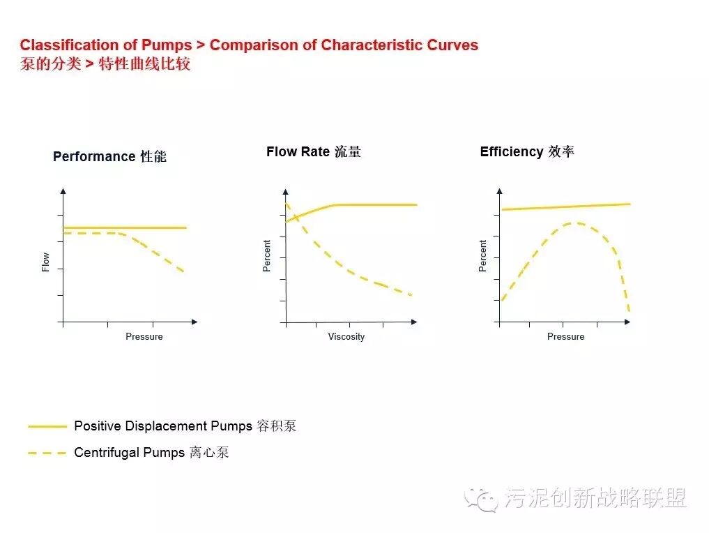 由于容积泵的结构特点,表现为比较高稳定性的性能曲线。下图是容积泵与离心泵的性能曲线对比: